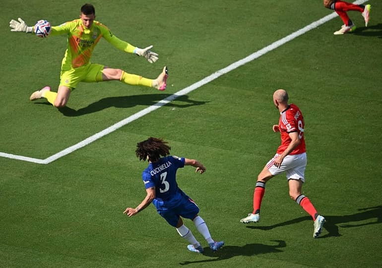 Và cuối cùng phút 108, The Blues cũng đã thành công. Sau khi cướp được bóng từ giữa sân, Chelsea đã lập tức triển khai đợt uy hiếp. Thủ môn Trubin không thể bắt dính cú dứt điểm của Caicedo và Nkunku dũng mãnh ập vào, nỗ lực sút bồi tung nóc lưới ở cự ly gần.